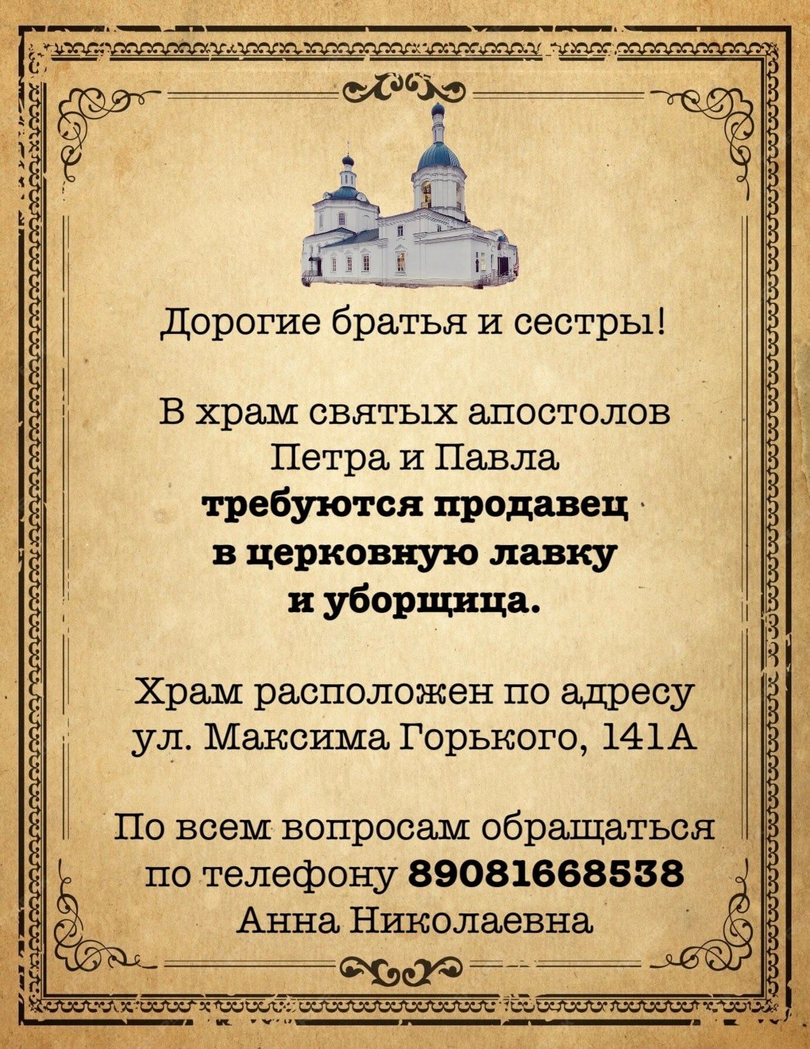 В храм святых апостолов Петра и Павла требуются продавец и уборщица